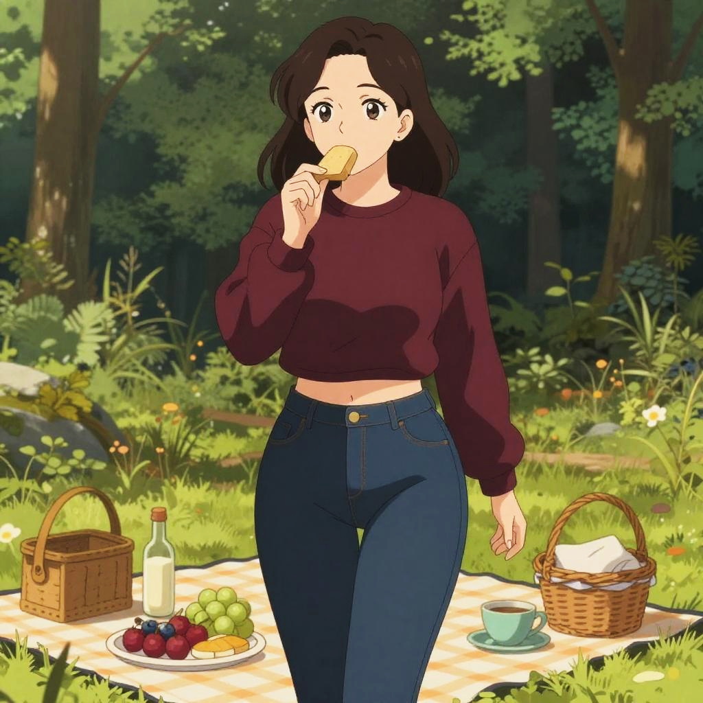 Anime-style illustration of a curvy woman with brown hair and beautiful eyes, wearing a cropped burgundy sweatshirt and high-waisted dark blue skinny jeans. She is enjoying a picnic in a woodland clearing with a checkered blanket, baskets, a bottle, fruits, and a cup of coffee. The scene features a lush green forest background.