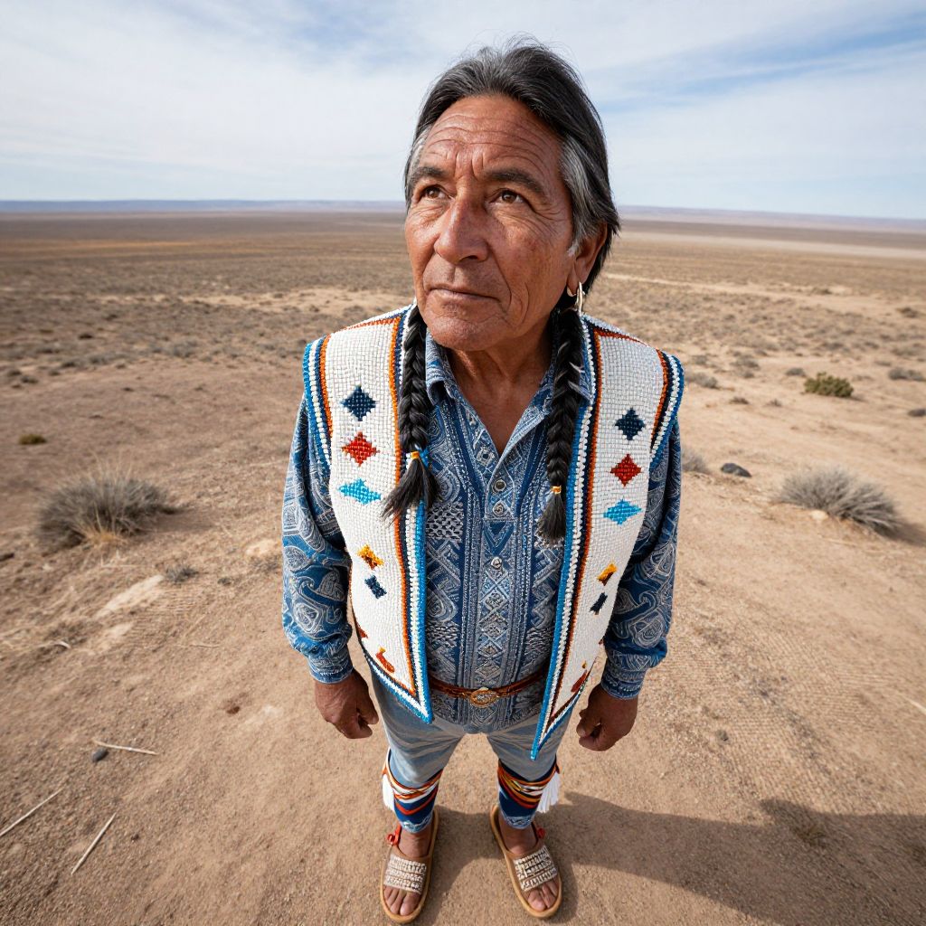 Craft a hyperrealistic portrait of a middle-aged Native American man with striking brown eyes and short, graying black hair. View him from an aerial perspective, showcasing intricate details on his weathered face, adorned with laughter lines and sunspots. Set against a vast desert landscape under an expansive sky, he stands tall in traditional attire: a beaded vest over a patterned shirt and leggings, complemented by intricately crafted leather moccasins. His expression exudes wisdom and resilience as he gazes contemplatively into the horizon, inviting viewers to connect with his ancestral lands and share in his reflective spirit.