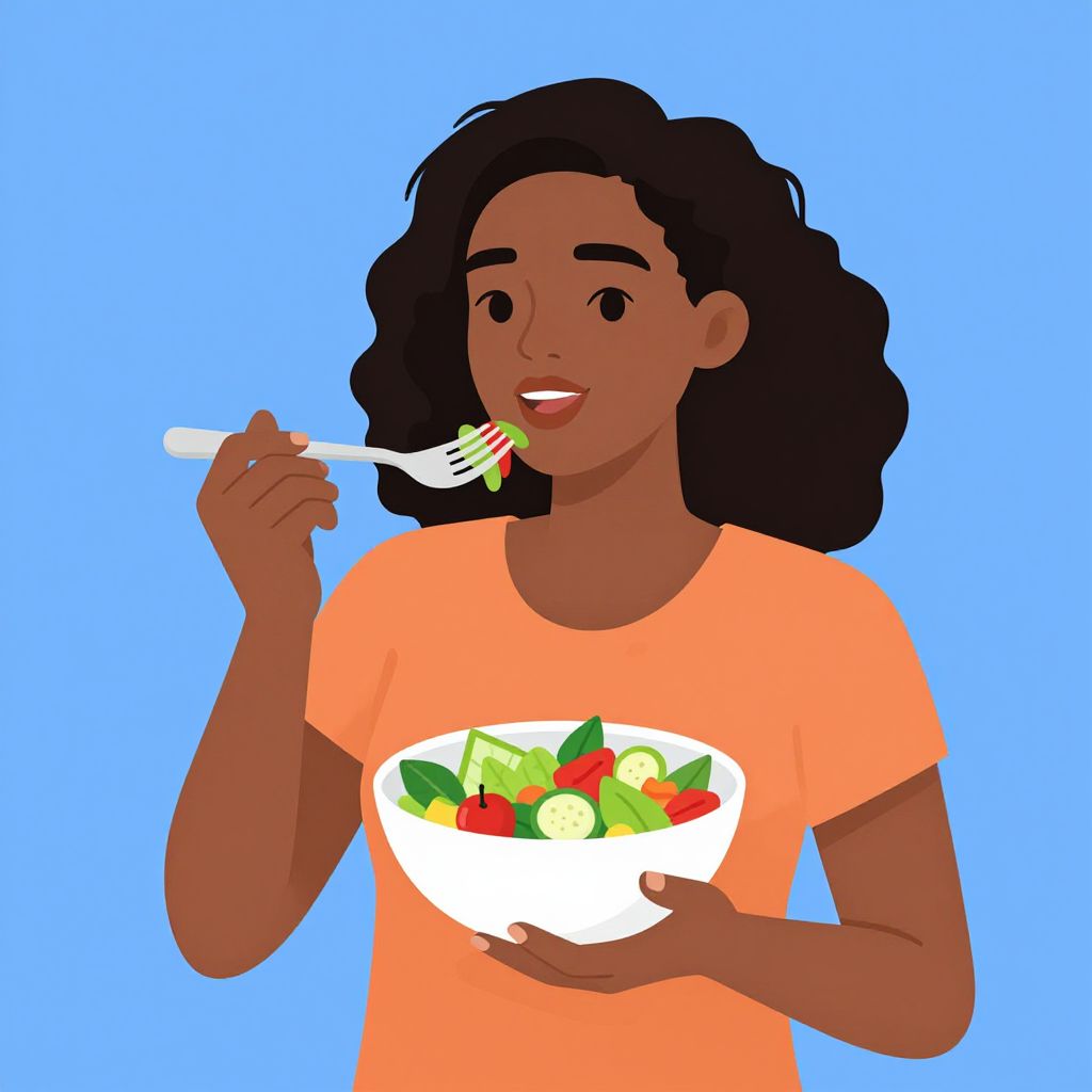 Digital illustration of a smiling Black woman with curly hair, wearing an orange shirt, eating a colorful salad with a fork against a blue background.