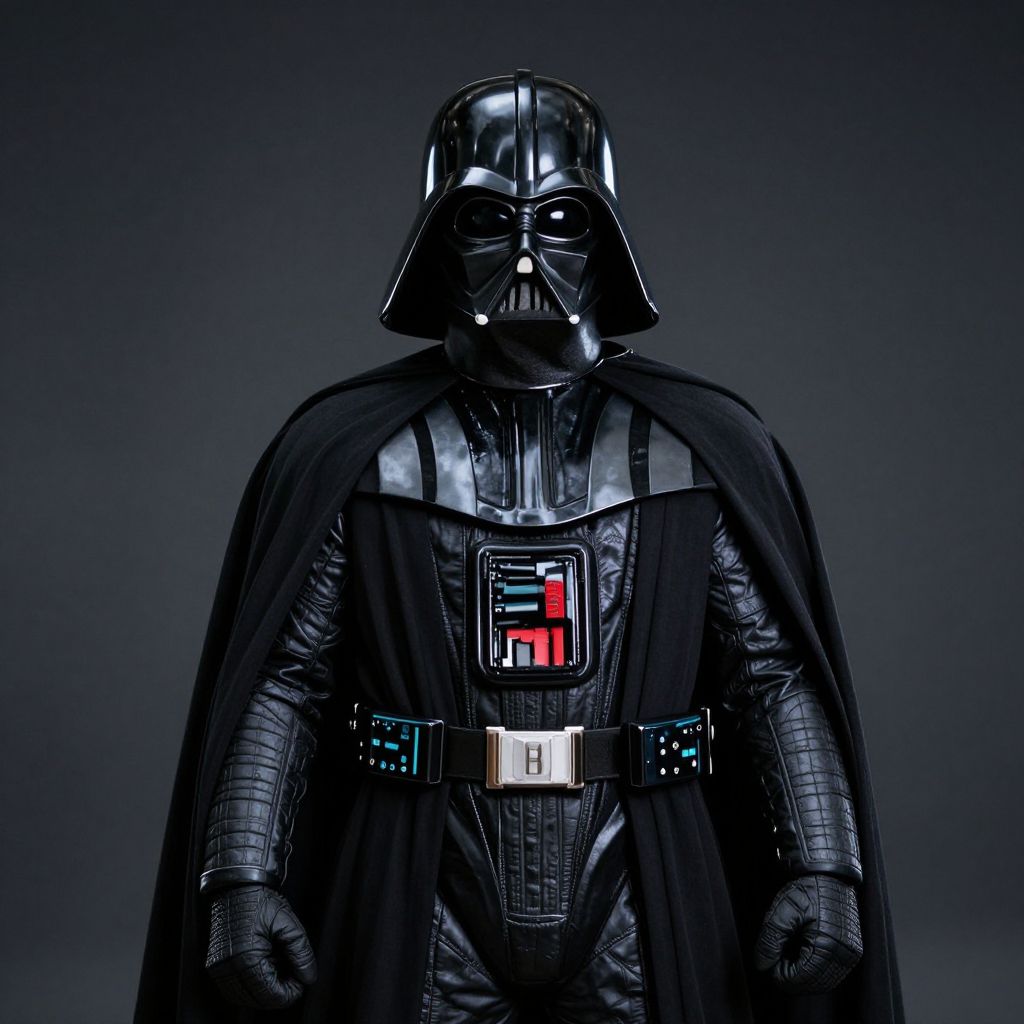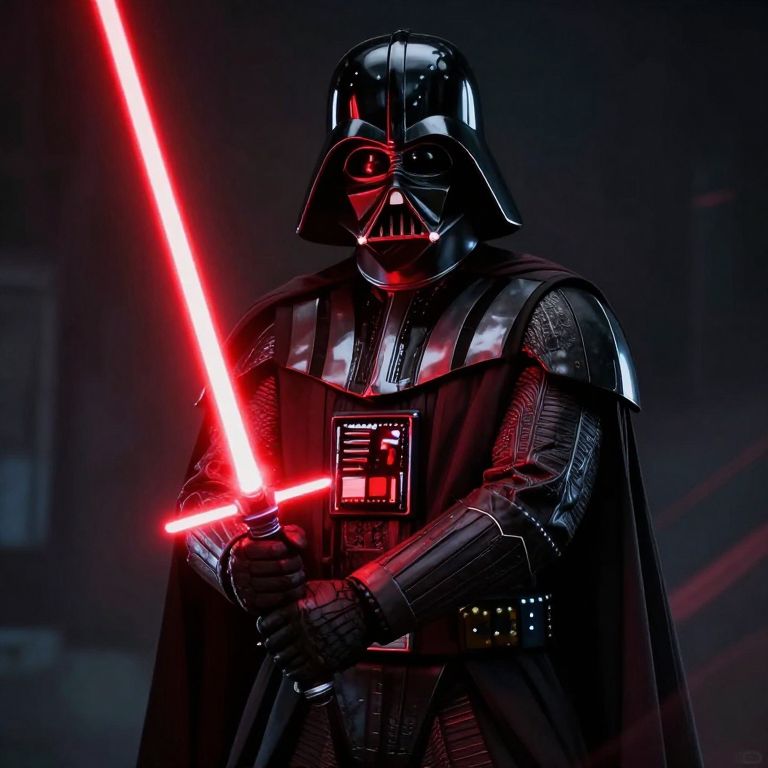 Darth Vader stands imposingly in a misty forest, his black armor gleaming under the diffused light, surrounded by moss-covered trees and a carpet of fallen leaves.