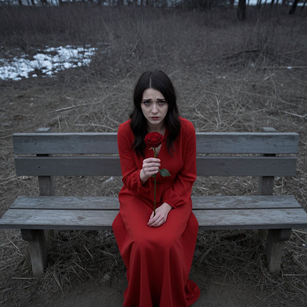 Photograph of a sad young woman with long dark hair, wearing a red dress, sitting on a wooden bench, holding a red rose in a barren