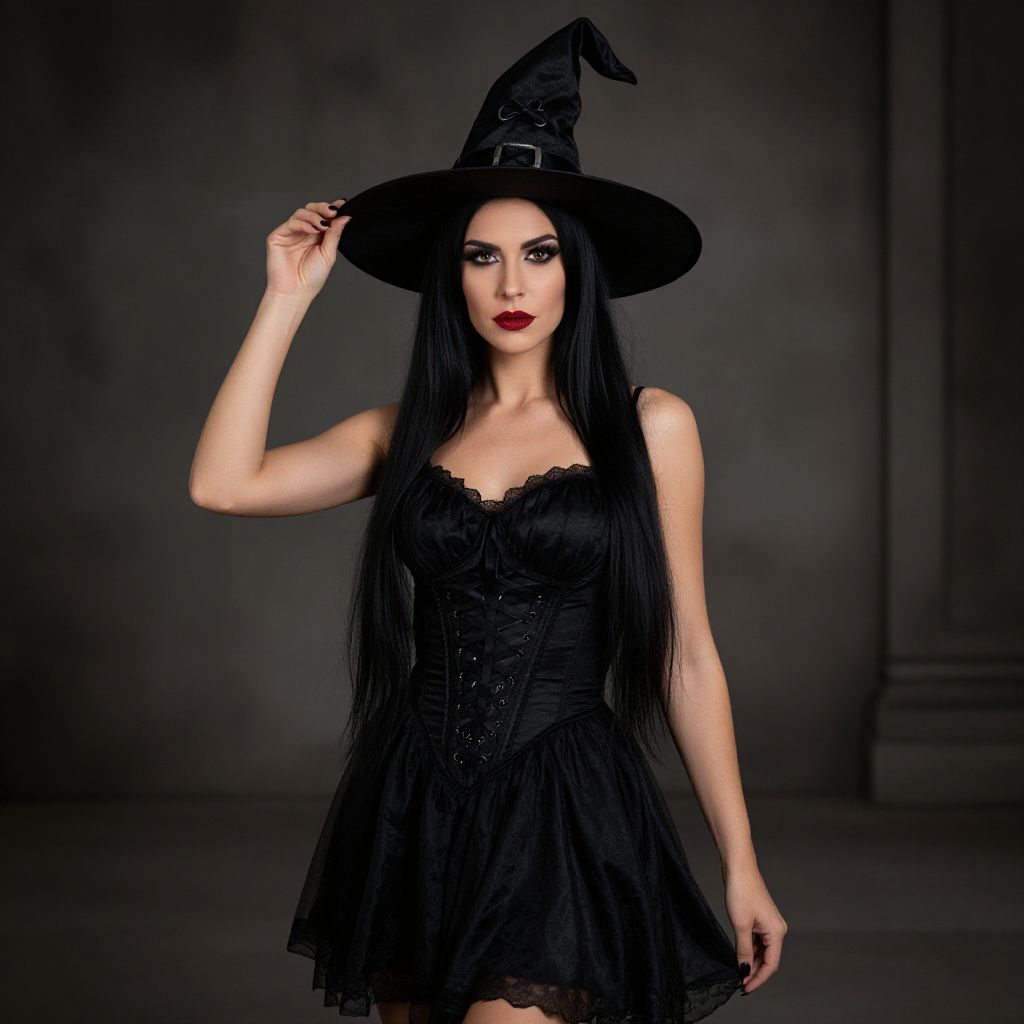 Photograph of a pale-skinned woman with long black hair, wearing a black witch hat, corseted black dress, and red lipstick, standing