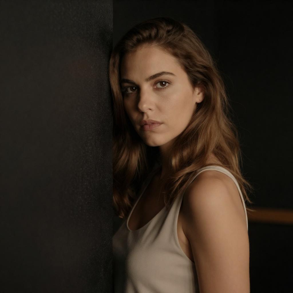Photograph of a woman with long brown hair, wearing a black leather jacket, standing in a dimly lit, blue-lit tunnel. She looks forward with a neutral expression. Background includes arched tunnel walls and bright light on the right. Blue light casts shadows. One person.