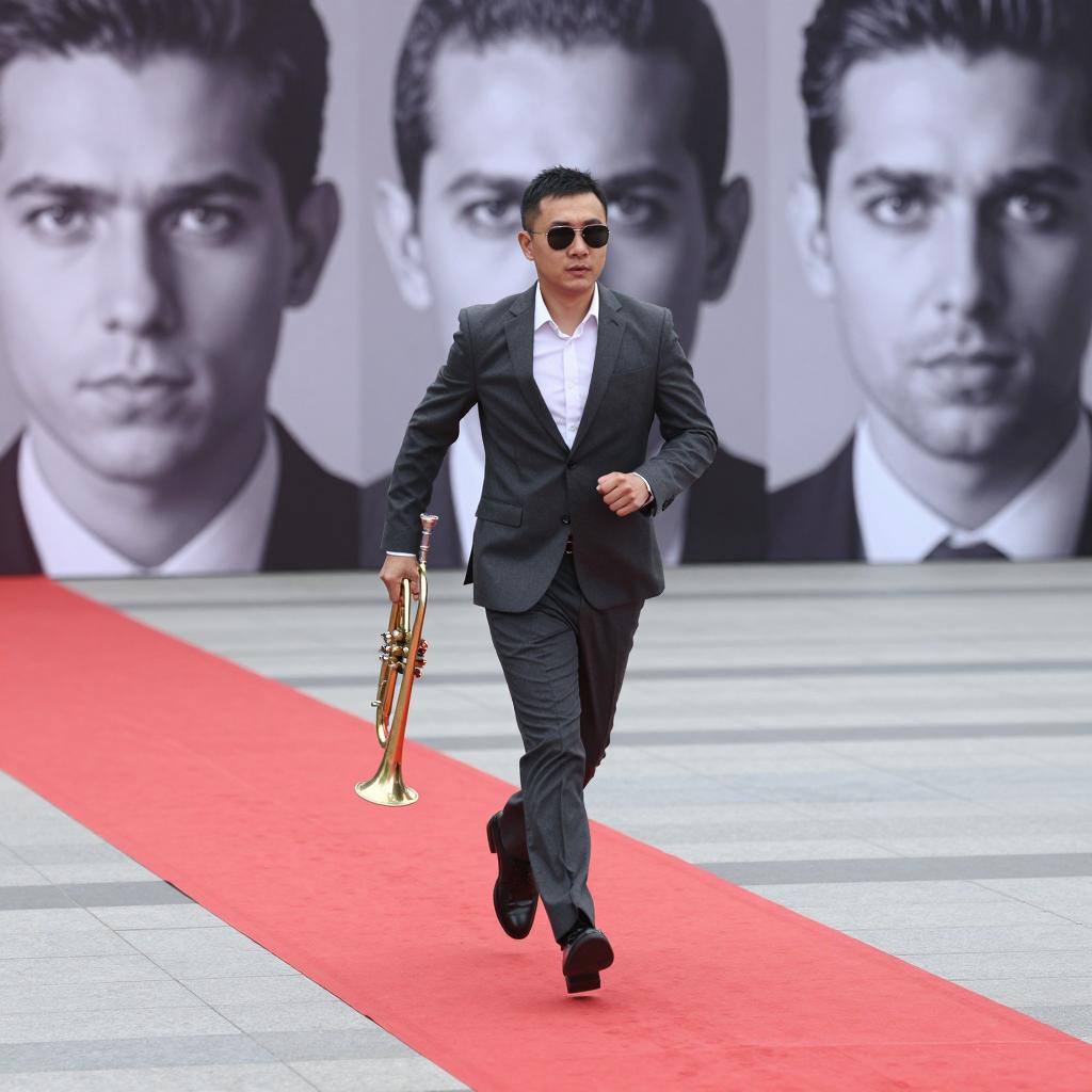Man in dark gray suit and white shirt running on red carpet, holding trumpet in right hand. Background has large grayscale images of three men's faces. Ground is tiled, light gray. Man's expression is focused. Three faces in background have intense expressions. Red carpet forms diagonal slope. Single person, centered, foreground.
