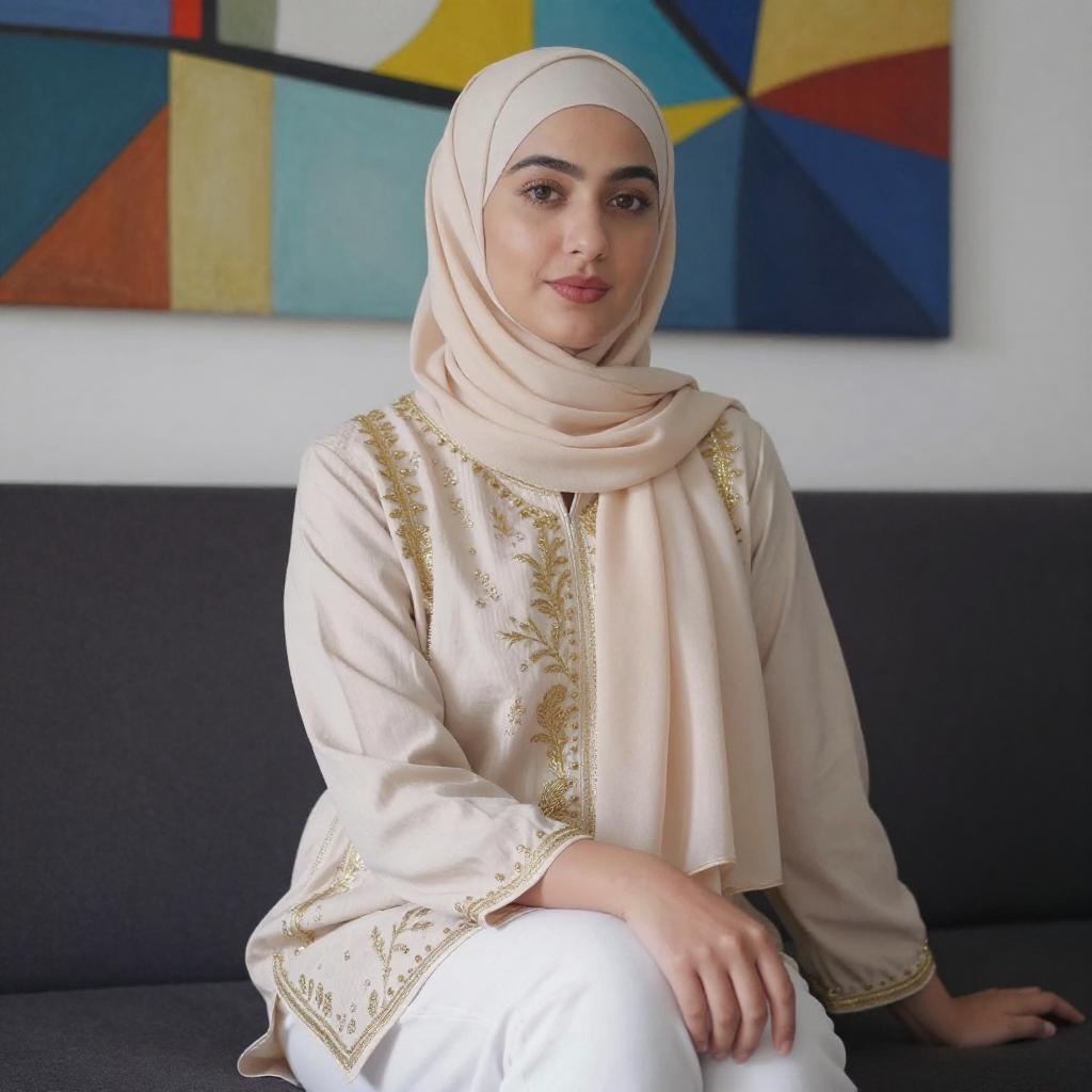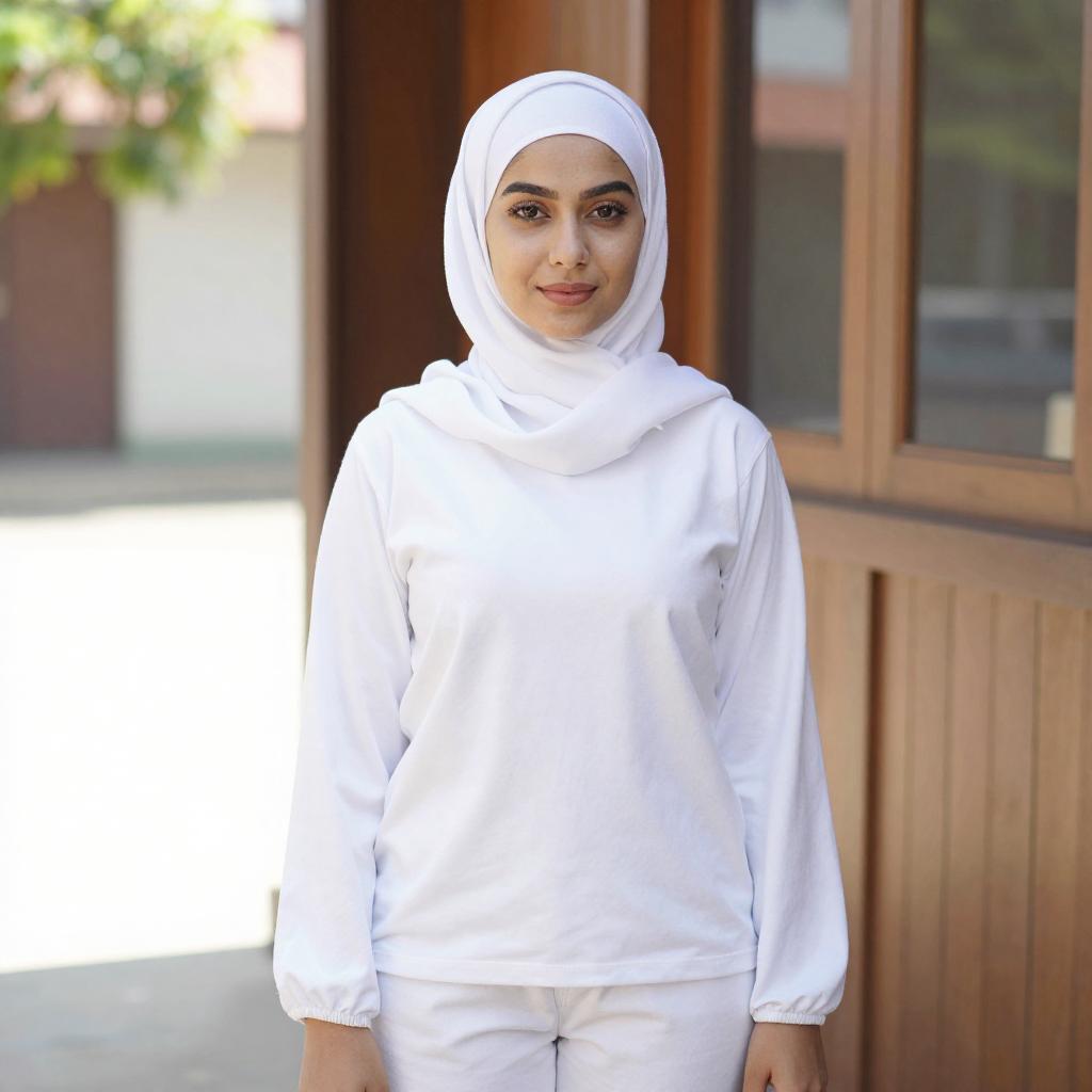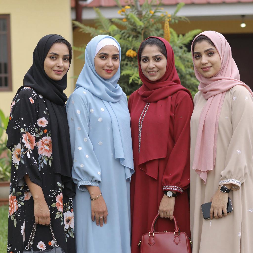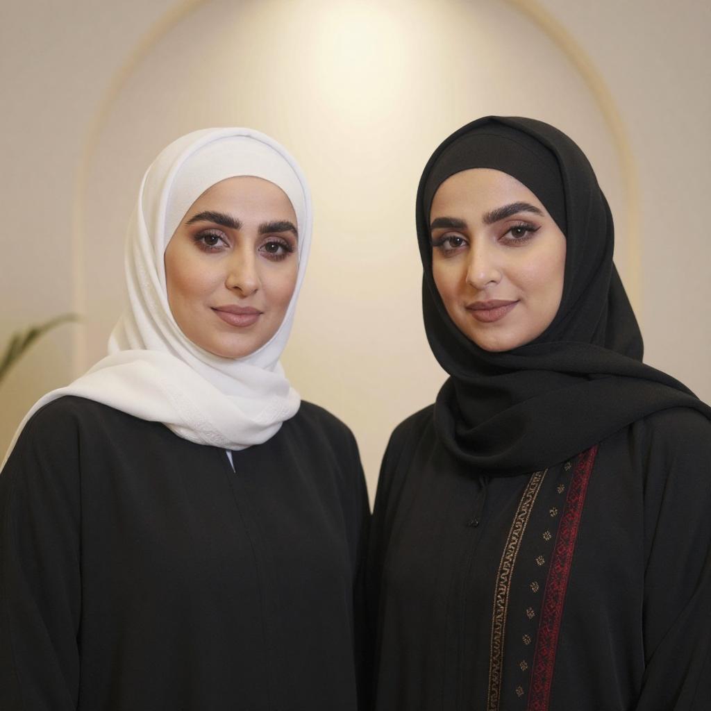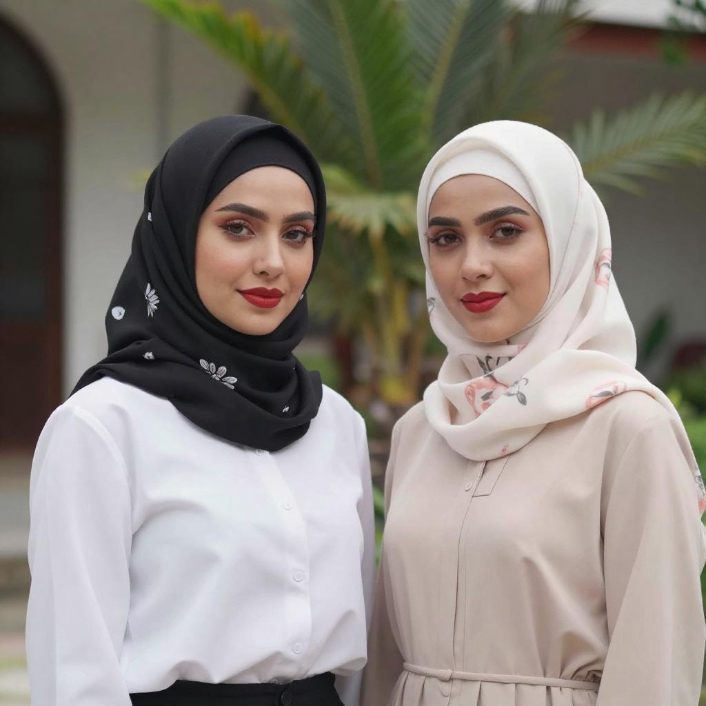 Two smiling women in traditional hijabs stand close together. The woman on the left wears a white lace hijab with a red and blue patterned scarf, while the woman on the right wears a maroon hijab with a matching patterned vest over a white blouse. They are in a warmly lit, arched interior space.