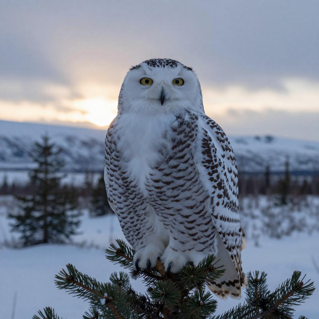 RAW Photo, DSLR close-up, snowy owl perched on a spruce branch, in Alaskan tundra with frozen landscape, at early morning twilight, chilly nature documentary film style, sunrays filtering through, cinematic lighting, professional color-graded.