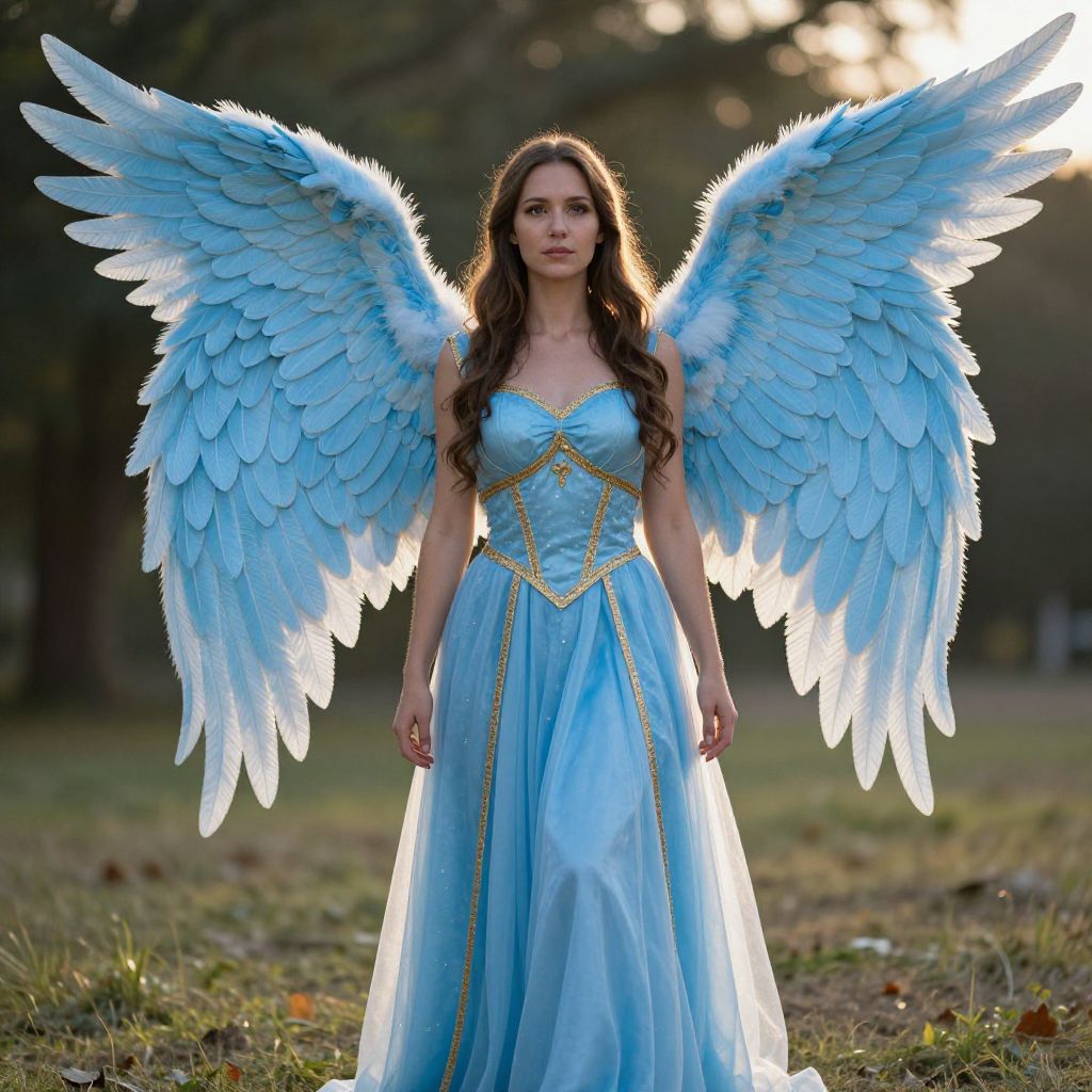 A woman stands outdoors wearing a stunning blue angel wings costume, featuring large, detailed wings and a flowing gown with gold trim. The photorealistic portrait is captured during golden hour, enhancing the serene and mystical atmosphere of the scene.