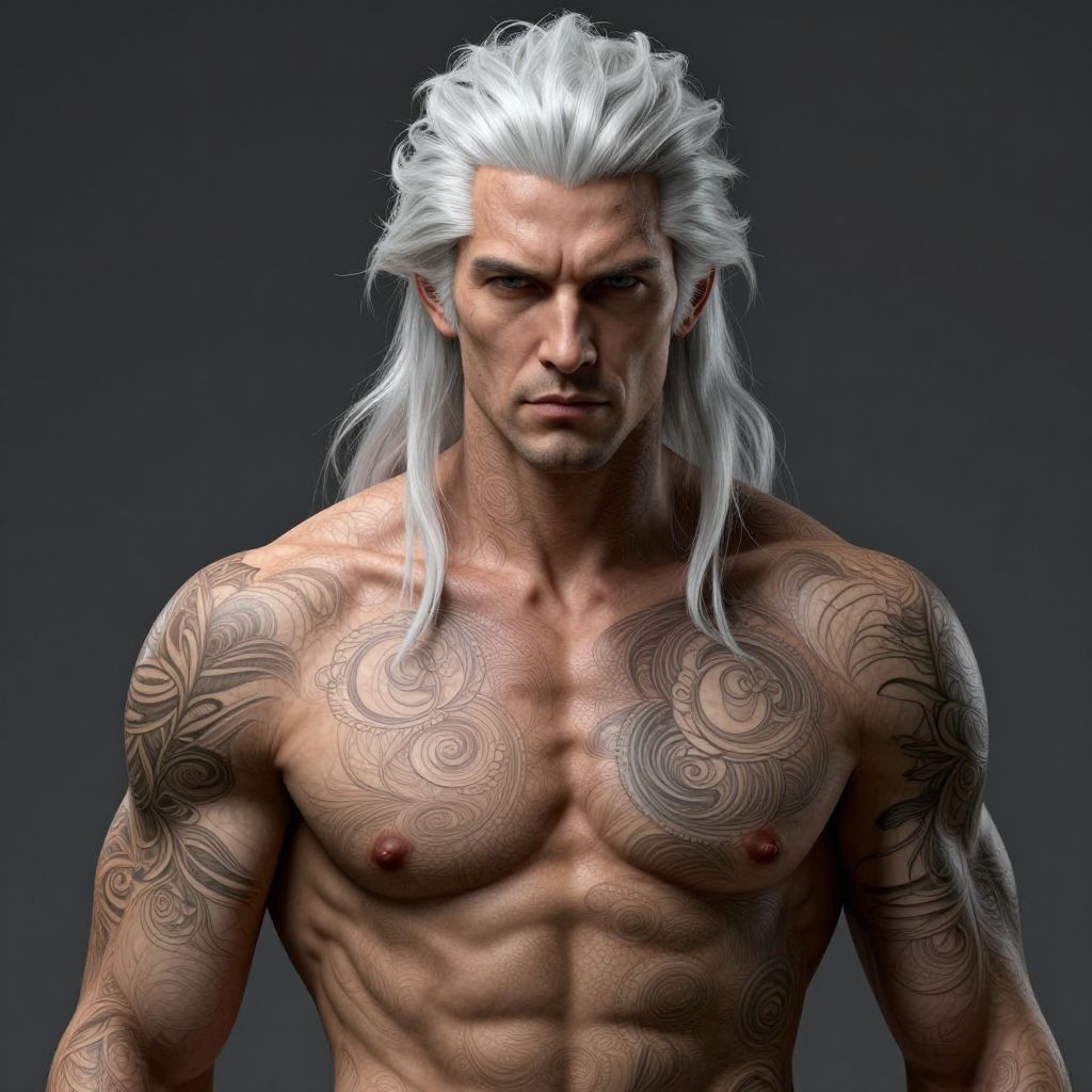 Hyperrealistic portrait of a man with white locks of hair rugged ripped body type upper body intricate photography heavily detailed 32 k 16 k artstation hq sharp focus illustration intricate elegant wlop artgerm greg rutkowski alphonse mucha medium shot dan mumford tomokazu matsuyama takoto yamamoto