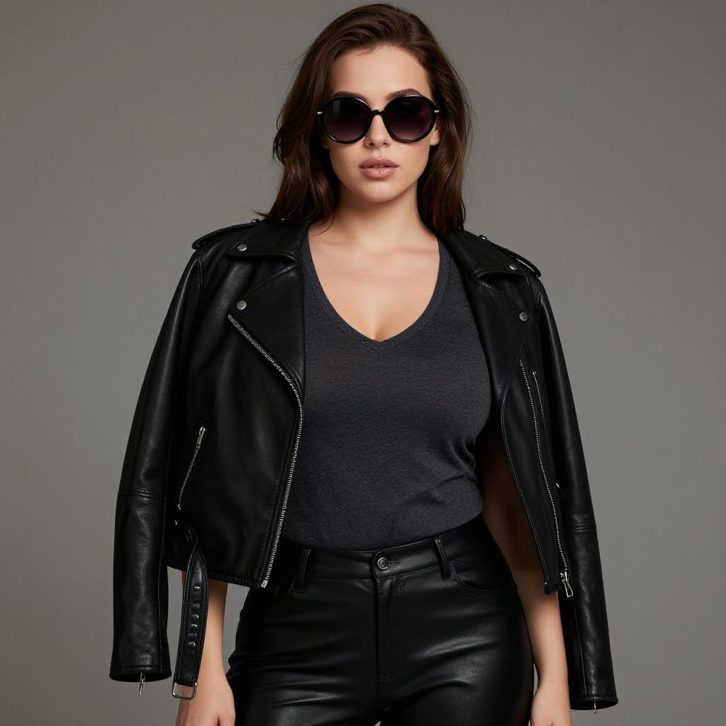 "Woman, edgy, black leather biker jacket with asymmetrical zip closure, dark grey V-neck T-shirt, fitted black leather pants, large round sunglasses with dark lenses.. Sexy. Pretty face and beаutiful eyes. Big breasts."