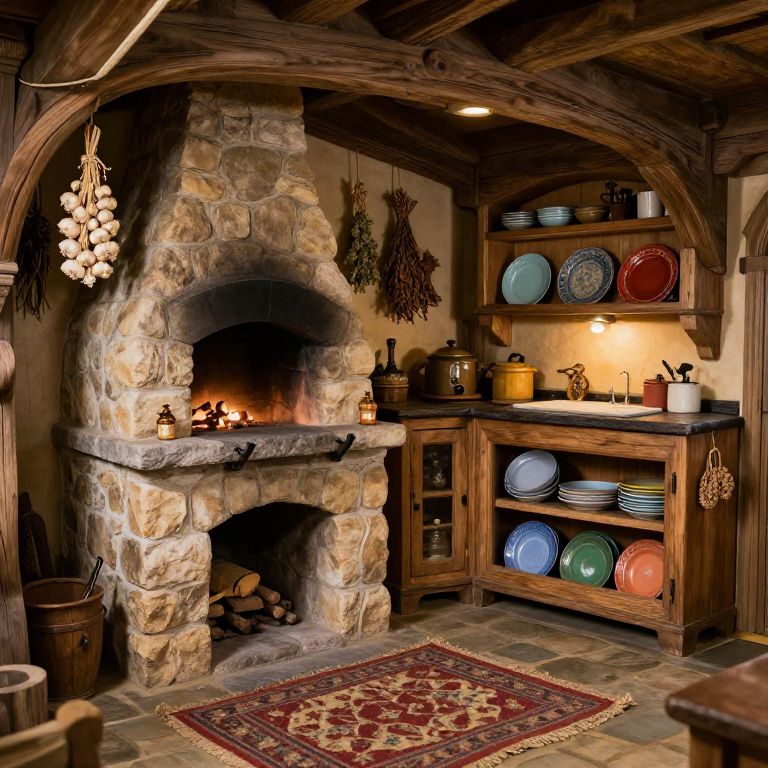 Photograph of a rustic kitchen featuring a stone fireplace with a glowing fire, set against a beige wall. Above the fireplace, dried herbs hang. Wooden shelves on the right display colorful ceramic dishes and cookware. A wooden cabinet below the shelves holds more dishes. A patterned red and gold rug lies in front of the fireplace. Reclaimed wood beams and a hanging garlic bulb add to the rustic charm. The floor is tiled in earthy tones. Warm, ambient lighting enhances the cozy atmosphere.
