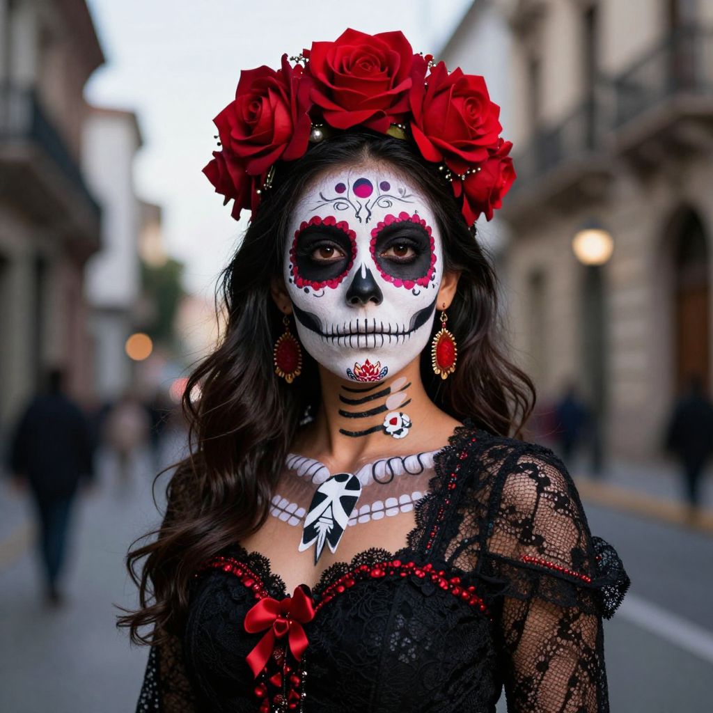 Photograph of a woman with white face paint, red flower crown, black lace dress, and intricate skull design, standing on a blurred street.