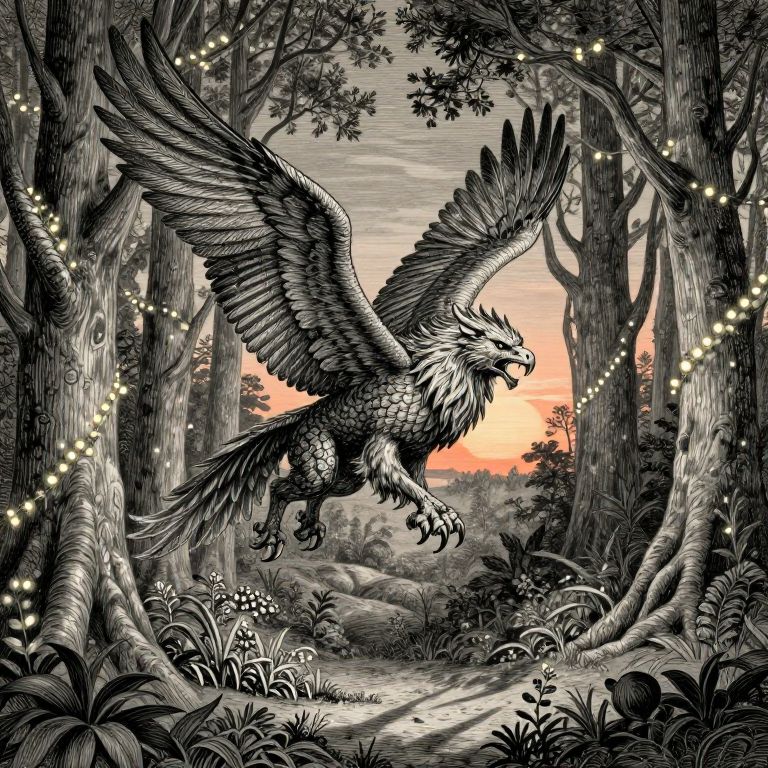 A detailed, black-and-white digital illustration depicts a majestic griffin with outstretched wings and sharp talons, mid-flight through a dense forest. The griffin's feathers are intricately textured, and its beak is open, revealing sharp teeth. The forest is filled with tall trees, their bark and branches meticulously detailed. String lights dangle among the trees, casting a soft glow. The background shows a vibrant sunset with warm orange and pink hues, contrasting with the dark forest. The forest floor is covered in various plants and ferns, adding depth and texture to the scene.