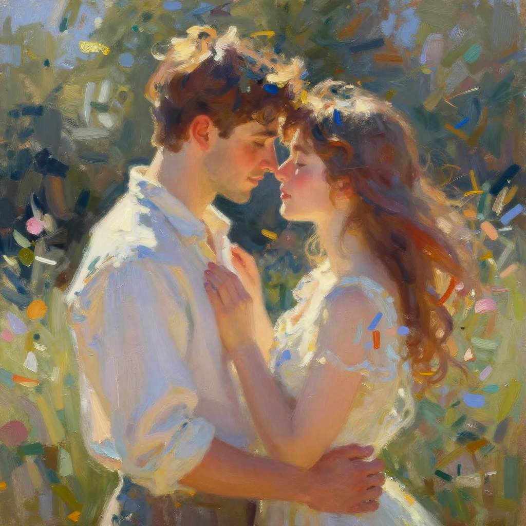 Lovers embrace painting with impressionist style, vibrant pastel colors, fluid brushwork, dreamy atmosphere, blurred edges, capturing intimate emotion and deep affection under soft sunlight