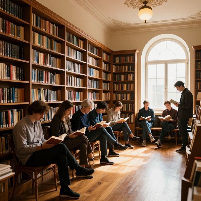 Warmly lit library scene featuring six individuals seated along wooden shelves filled with books, engaged in reading and discussion, while a seventh person stands near a large arched window, casting natural light that illuminates the polished wooden floor and ornate ceiling fixtures.