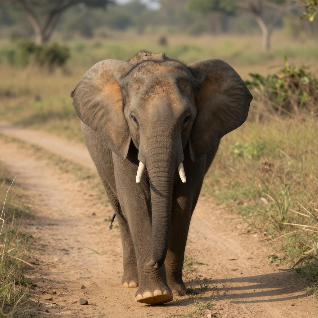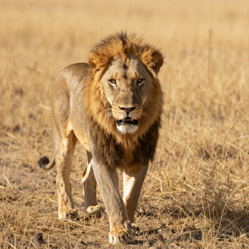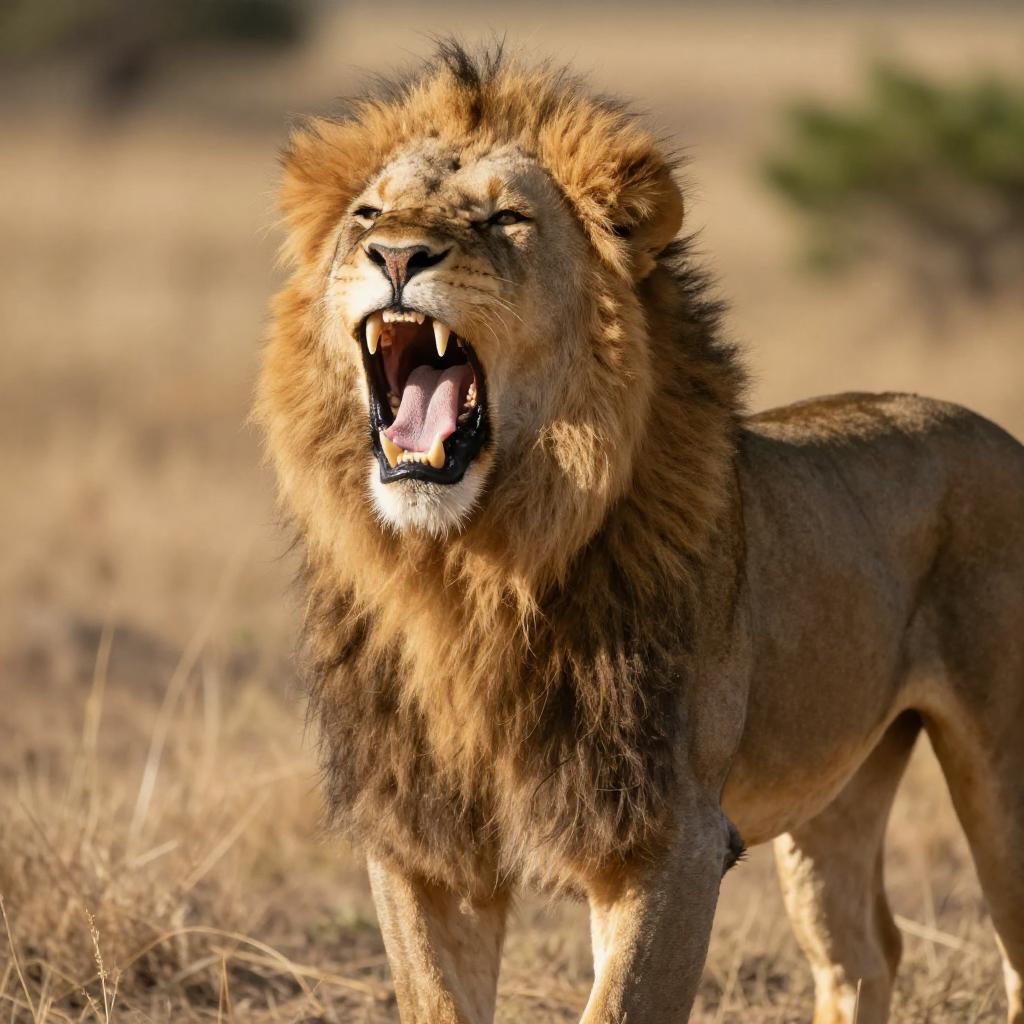 Photograph of a large crocodile lying in dry, golden grass, taken at eye level with a shallow depth of field. The crocodile's mouth is wide open, revealing sharp teeth and a pink tongue. The lighting is warm and golden, casting shadows on the crocodile's rough, textured skin. The background is slightly blurred, focusing attention on the crocodile. The camera angle is low and direct.