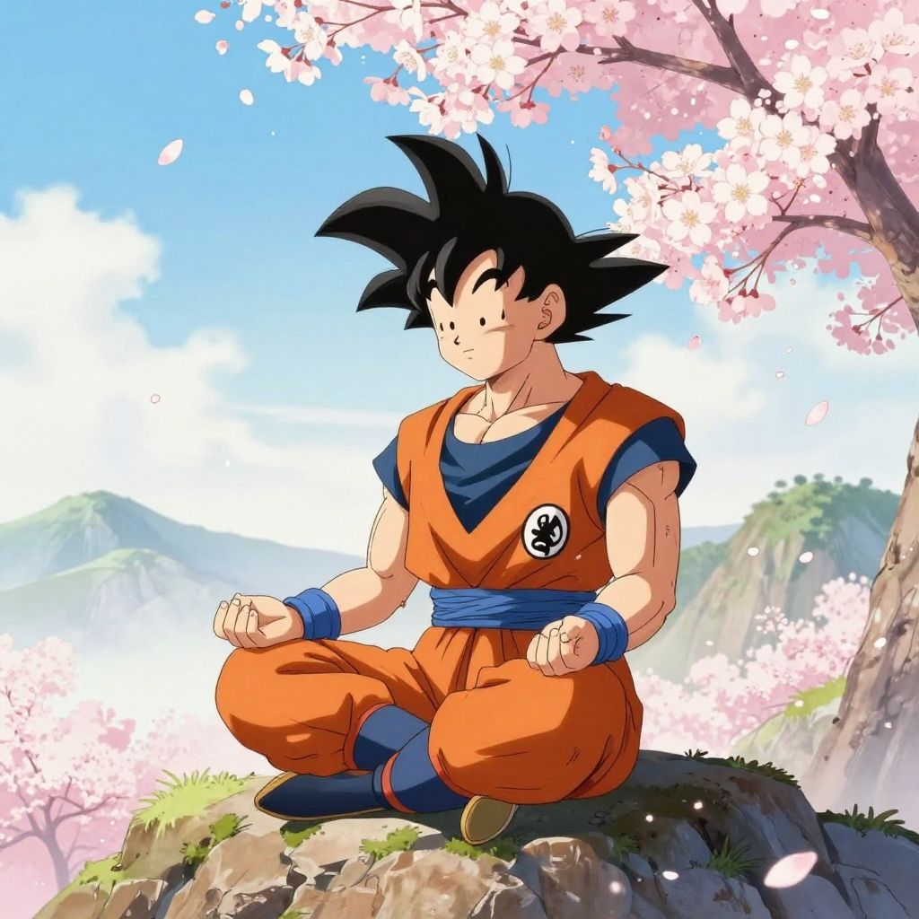 Goku looking down peacefully, meditating on a mountain peak, cherry blossoms falling gently around, soft pastel colors, serene anime landscape with a calming atmosphere and delicate shading