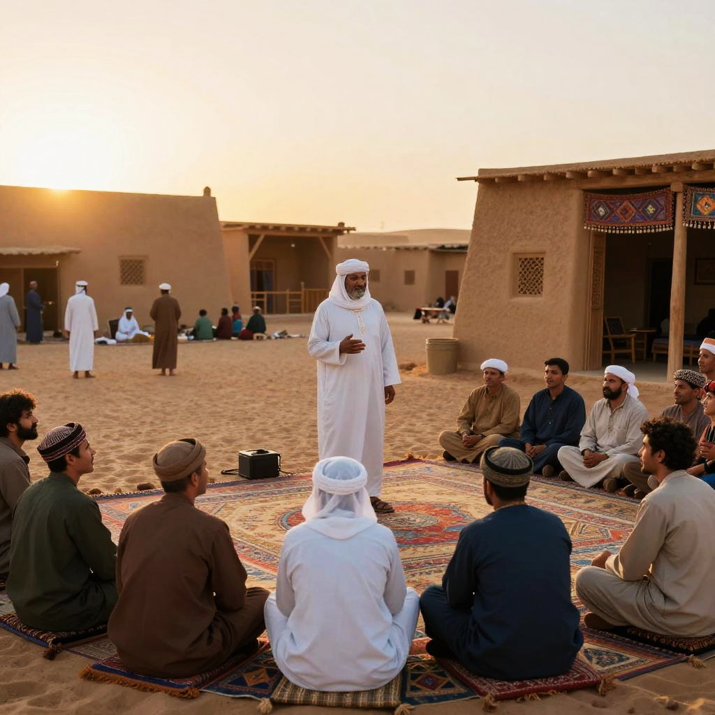 A Bedouin man in traditional white attire shares stories with a seated group in a desert oasis caravanserai. The setting is warm and sandy with traditional rugs and mud-brick buildings under a soft glowing sunset. The group attentively listens, dressed in traditional Middle Eastern clothing, highlighting cultural heritage and storytelling traditions.