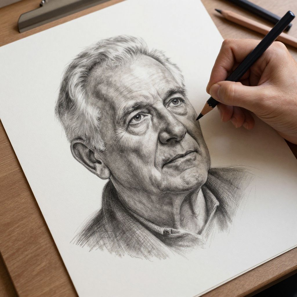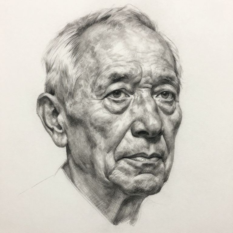 Realistic face sketch of an elderly man with deep wrinkles and expressive eyes, charcoal pencil drawing on textured paper, hyper-detailed shading and contours capturing emotional depth, soft light highlights and shadows creating lifelike features