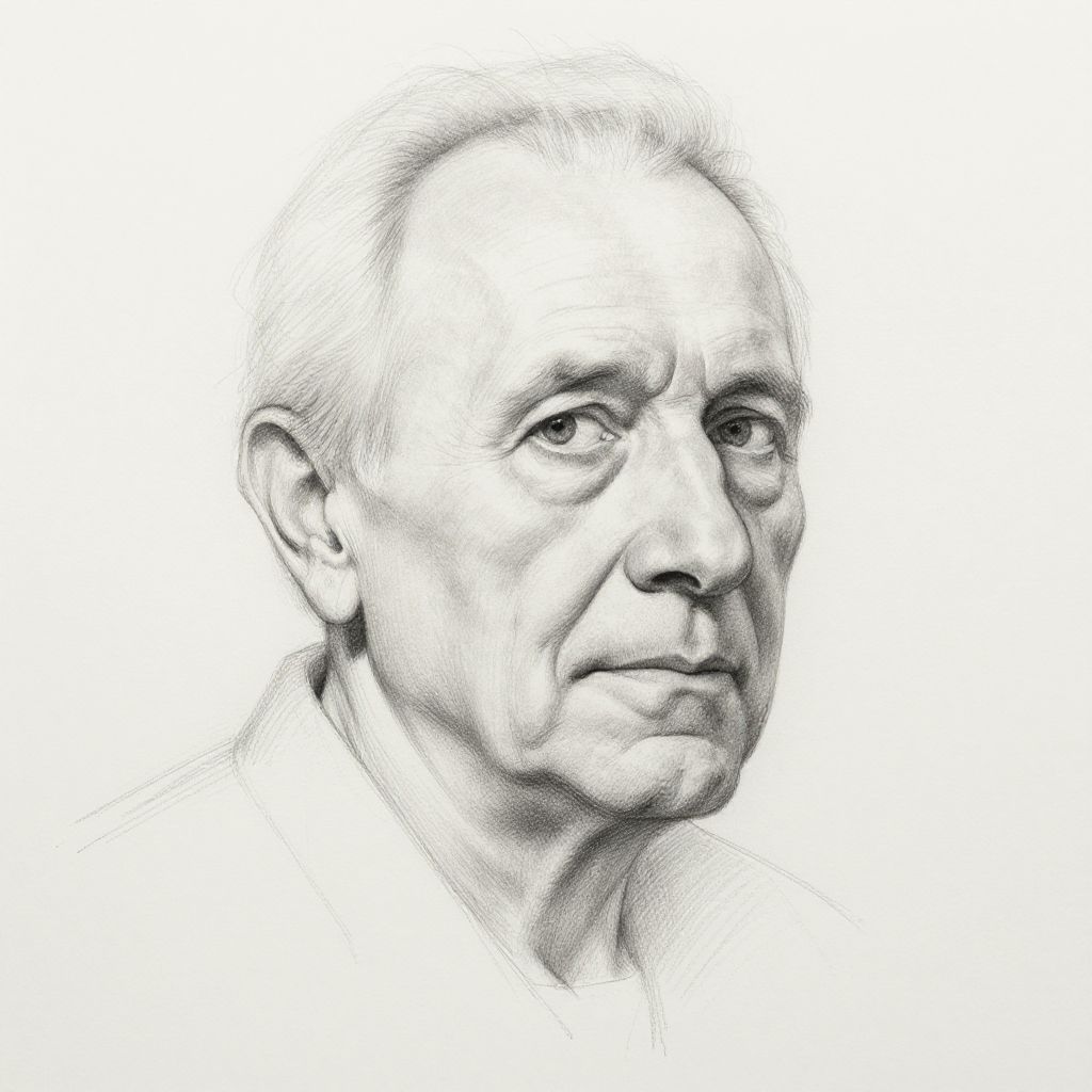 Black-and-white pencil drawing of an elderly bald man with wrinkles, prominent nose, and serious expression, viewed from the front.