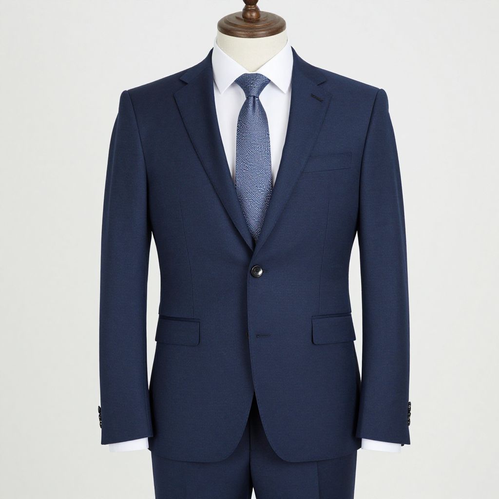 Photograph of a dark blue, single-breasted suit with a white shirt and patterned navy tie, displayed on a wooden mannequin.