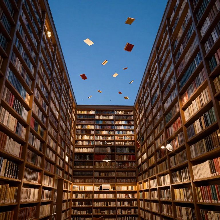 Photograph of a grand, multi-story library with tall, wooden shelves filled with books on all sides, creating a narrow, rectangular corridor leading to a central, brightly lit area. The sky above is a deep blue, and various colorful paper airplanes float in the air, adding a whimsical touch. Warm, yellow light emanates from ceiling fixtures, highlighting the books. The shelves are uniformly arranged, and the books are neatly aligned, with their spines facing outward, creating a repetitive, patterned texture. The overall atmosphere is both academic and playful.