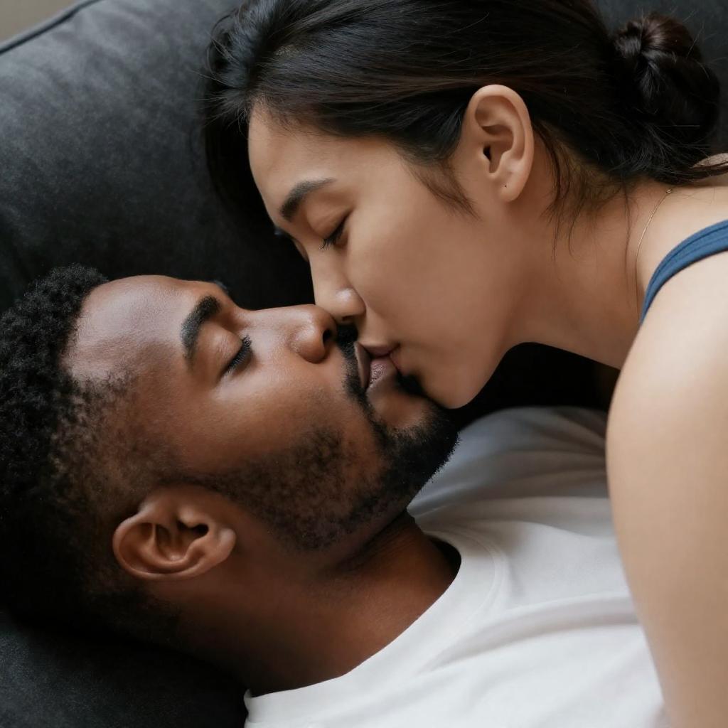 Photograph of a close-up kiss between a Black man and an Asian woman with closed eyes. The man has short black hair, a trimmed beard, and wears a white shirt. The woman has dark hair in a bun, light skin, and wears a blue top. They lie on a dark surface with her head resting on a pillow. Soft, warm lighting.