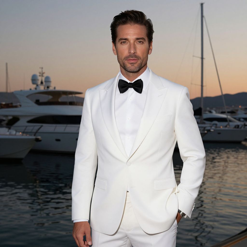 Photograph of a handsome man with dark hair and beard, wearing a white tuxedo with black bow tie, standing in front of a marina