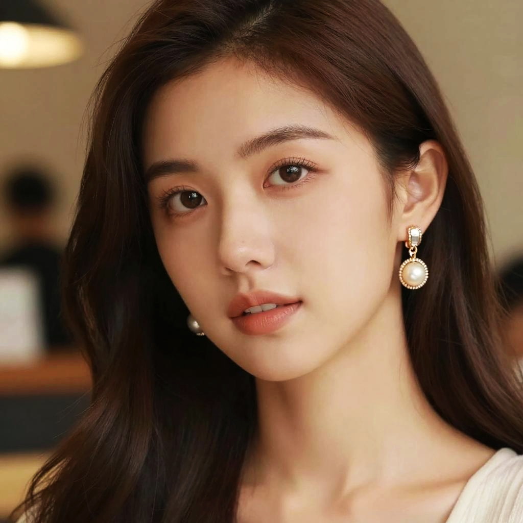 Photograph of an East Asian woman with fair skin and long, dark brown hair, slightly parted to the side. She has large, dark brown eyes, subtly arched eyebrows, and full lips with a neutral expression. She wears small, pearl drop earrings with a gold accent and a white top with a low neckline. The background is softly blurred, featuring warm, indoor lighting and indistinct objects, suggesting a casual setting. The image focuses on her face and upper shoulders, capturing her natural beauty and calm demeanor.