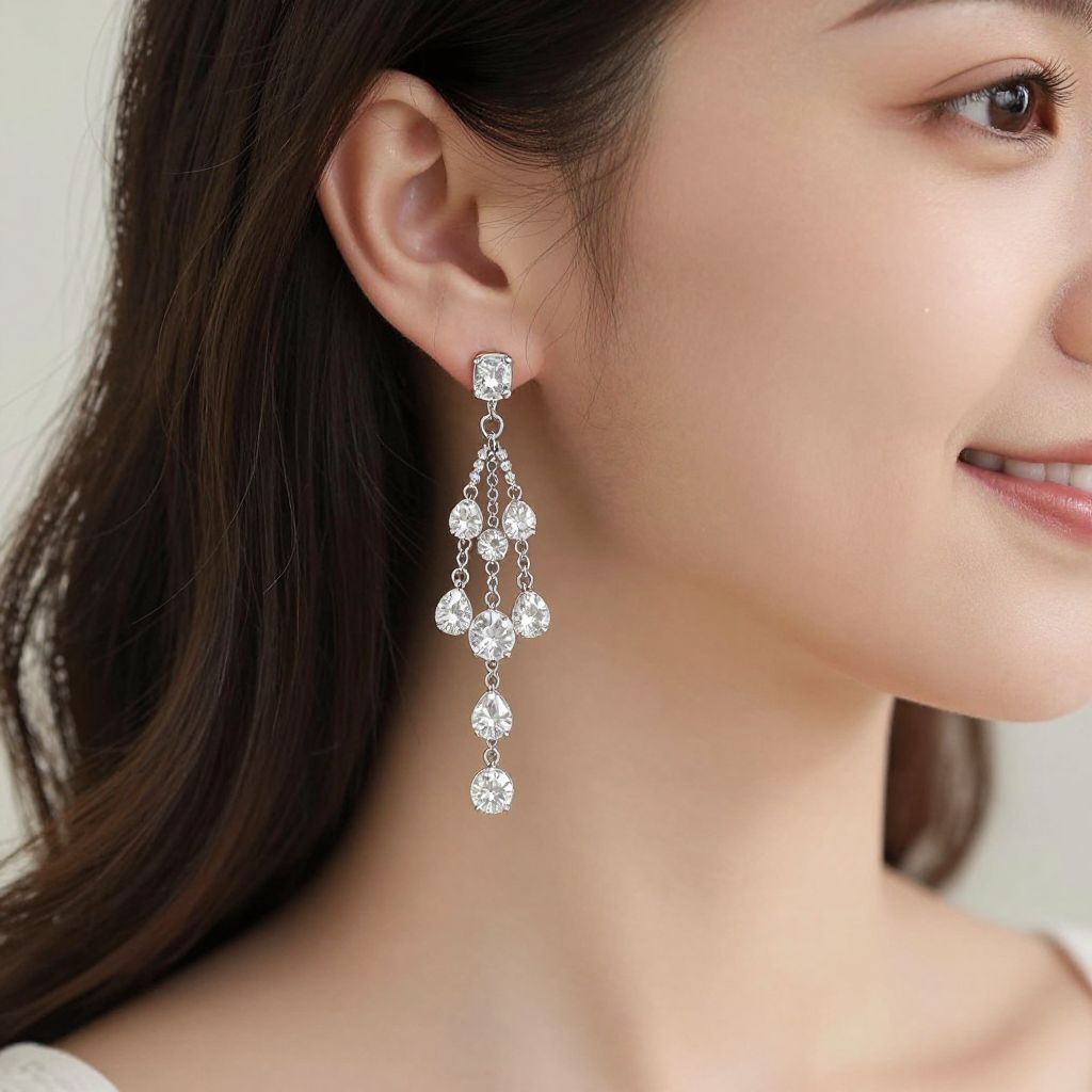 Elegant silver crystal bridal earrings cascade gracefully from a woman's ear, featuring three tiers of sparkling stones that shimmer against her soft, styled hair and radiant smile.