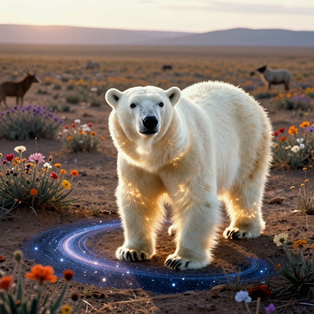 A beautiful Polar Bear, full-body, glowing with magical energy. The background is an endless desert of flowers and wildlife on the horizon as sunlight glows from a starry pool to surround them in intricate patterns reminiscent Of Simon Pegg's surreal landscapes for 'Interstellar' 2000s vintage Raw photo style by John Cole, 2000s vintage RAW photo, photorealistic, film grain, candid camera, color graded cinematic, eye catchlights, atmospheric lighting, imperfections, natural, shallow dof, High level of detail to create a photographic-like image, focusing on lighting, realistic textures, hyperdetailed.