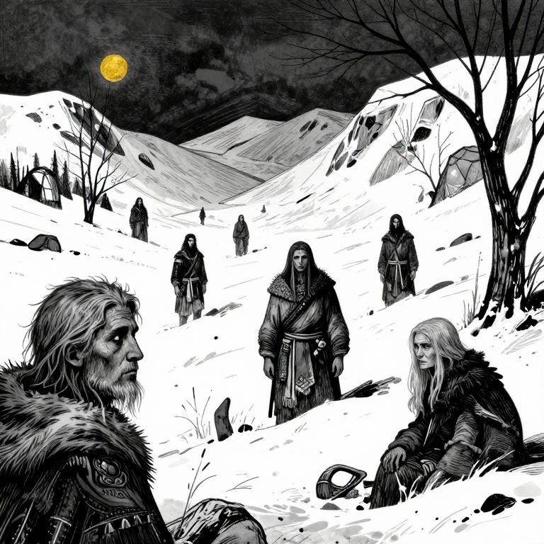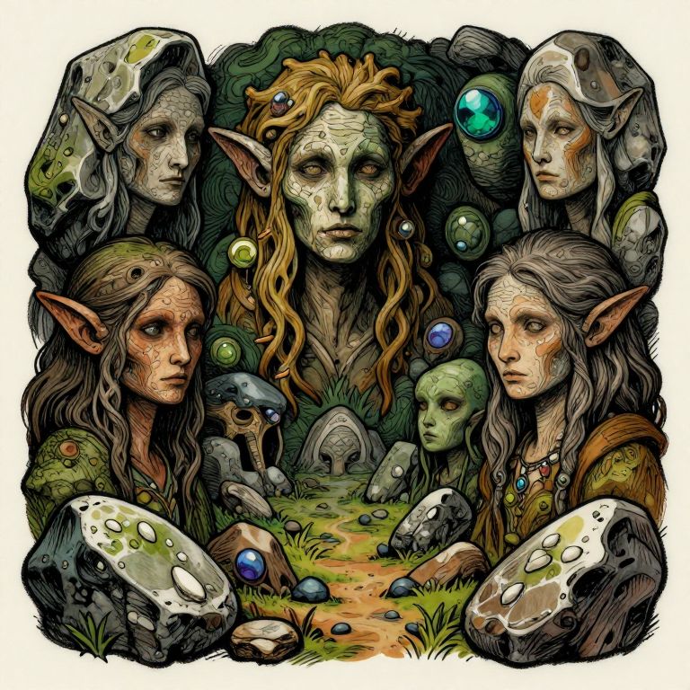 Digital drawing in a detailed, monochromatic comic style depicting six ethereal, forest-dwelling individuals with pale skin and long, wavy hair. They have serious, almost melancholic expressions and wear simple, earth-toned garments adorned with blue gemstone pendants. Their eyes are large and expressive, emphasizing their otherworldly appearance. The background is a dense forest with dark, shadowy trees and lush greenery. The central figure, a young girl with braided hair, stands out as the focal point, surrounded by five older individuals, including a bearded man with a long white beard in the background. The overall mood is mysterious and somber.