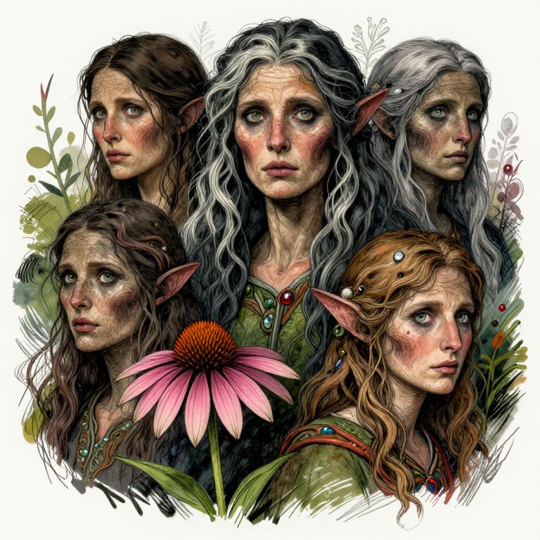 Digital drawing of six ethereal, forest-dwelling, long-haired children and an elderly man with beards, wearing brown cloaks and blue gem