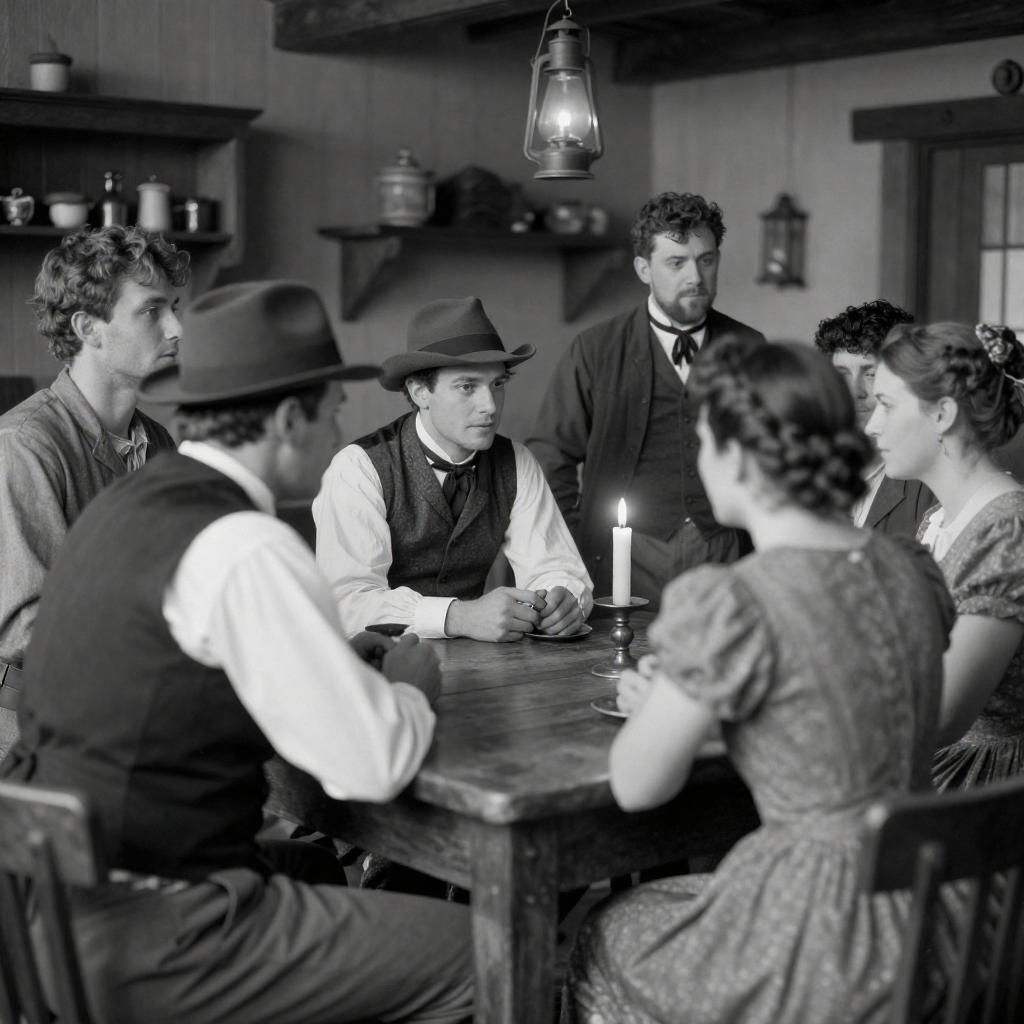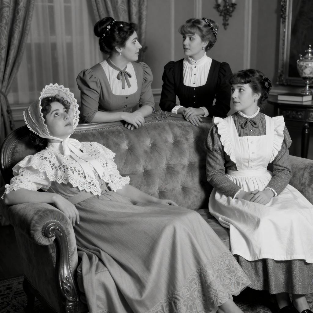 Black-and-white photograph of four women in Victorian-era clothing reclining on a plush sofa in a luxurious room. The woman on the left, with a bonnet and lace shawl, leans back dramatically. The woman on the right, wearing a frilled apron, sits upright. The background features ornate curtains and a wooden table with a book.