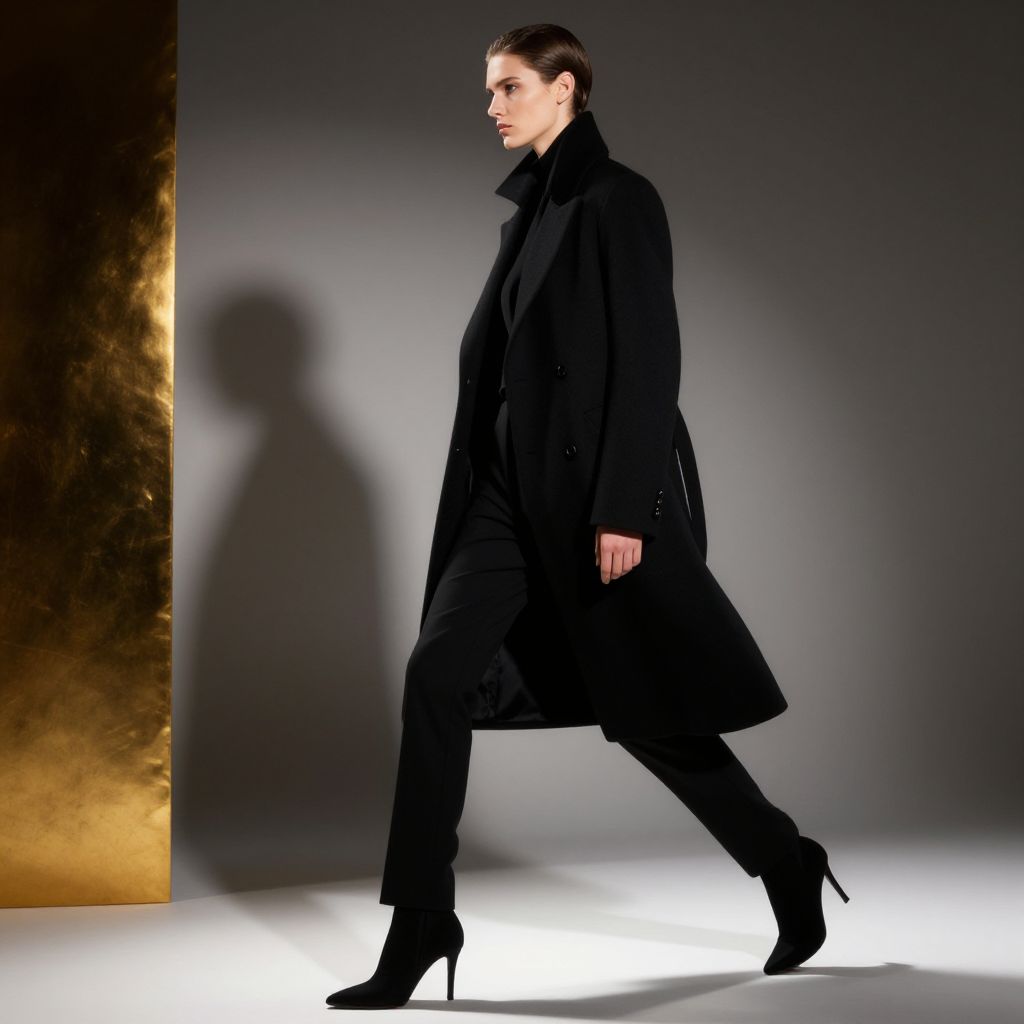 A high-fashion runway moment: a model in a luxurious black coat and tailored pants poses mid-stride in a studio setting with dramatic shadows, gold accents, sharp lines, cinematic composition, Flux-style realism