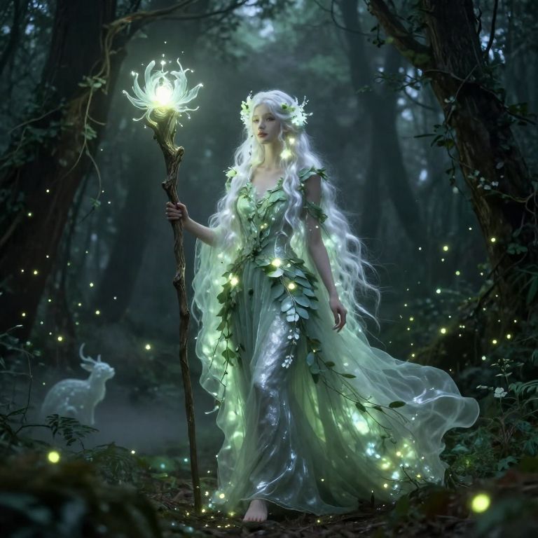 Fantasy digital artwork of a glowing, ethereal forest fairy with long white hair, wearing a leafy, luminous dress, holding a magical staff