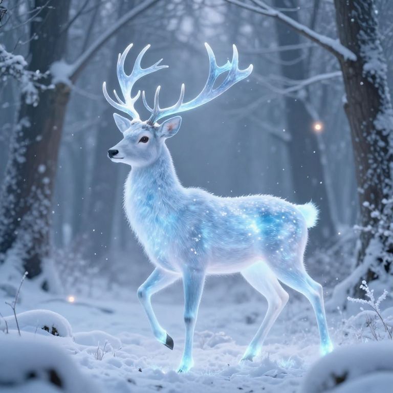 A luminous, ethereal deer with icy blue fur and glowing antlers strides through a serene, snow-covered forest, its otherworldly presence illuminated by soft, magical lights, evoking a dreamlike, fantasy-inspired digital artwork.