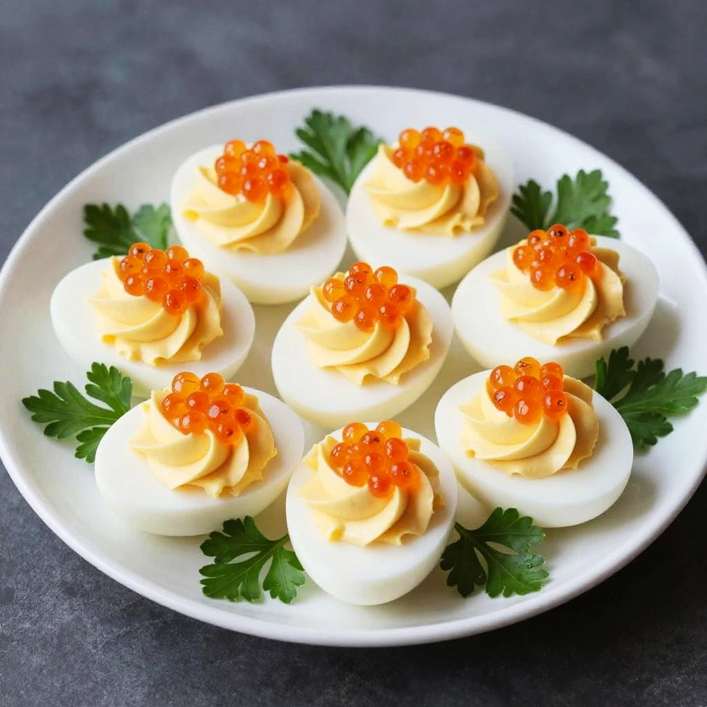 A close-up photograph of a white plate filled with seven deviled eggs, each topped with a swirl of bright orange salmon roe. Fresh green parsley leaves are scattered around the eggs, adding a pop of color. The plate sits on a dark, textured surface, creating a contrasting background. The lighting highlights the vibrant colors and textures of the dish.