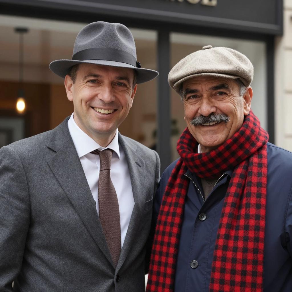 Photograph of three men in a festive outdoor setting. Elder man with white hair, gray mustache, black suit, and tie. Young boy with blond hair, blue turtleneck. Middle-aged man with brown top hat, purple coat, beige bow tie. Brightly colored holiday decorations, red and yellow balloons, and a large yellow mushroom-shaped ornament in the background. All three men standing closely together, the middle-aged man slightly in front.