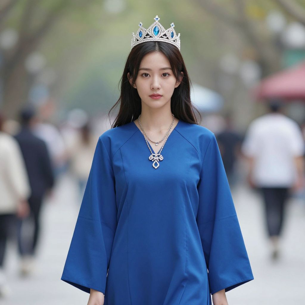 Photograph of an Asian woman with long black hair, wearing a silver tiara, blue dress, and necklace, standing in a blurred urban park.