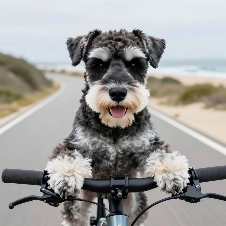 Dissolve black schnauzer+white eye browns+white beard+paws on the steering wheel, driving in high speed a bike in beach road,front view camera,