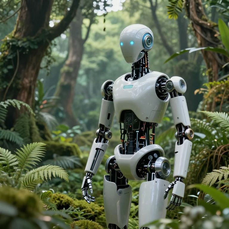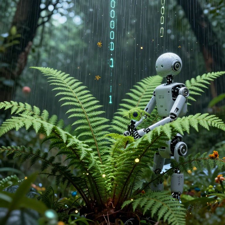 Robotic ferns grow on digital suns, absorbing binary rain and producing thoughts as spores, whispering concepts into the minds of online dreamers.