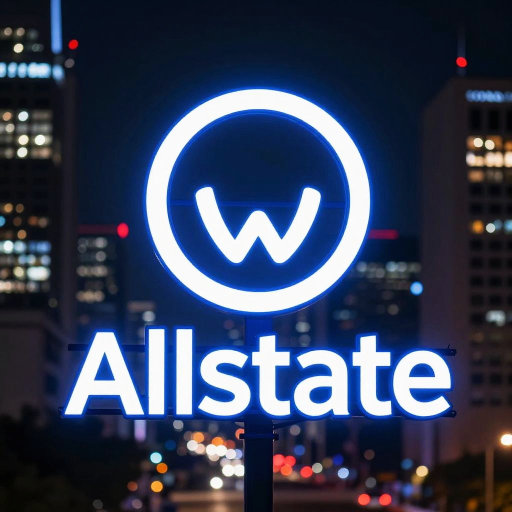 Allstate logo white illuminated in neon style against a dark urban backdrop, vibrant glow effect, dynamic modern city night scene, high detail