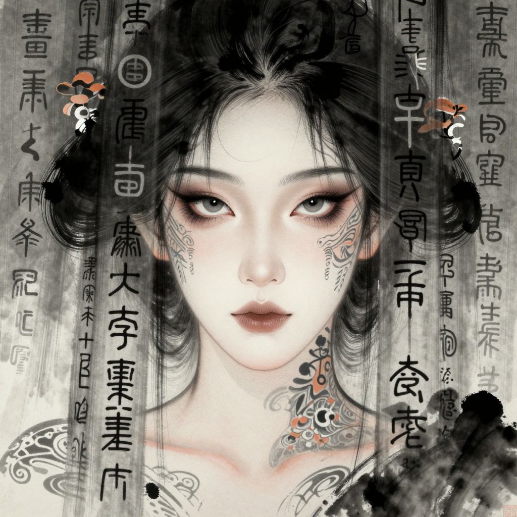Digital art of a pale, Asian woman with black hair and intricate tattoos, intense eyes, surrounded by Japanese text, in a grayscale, ethereal style