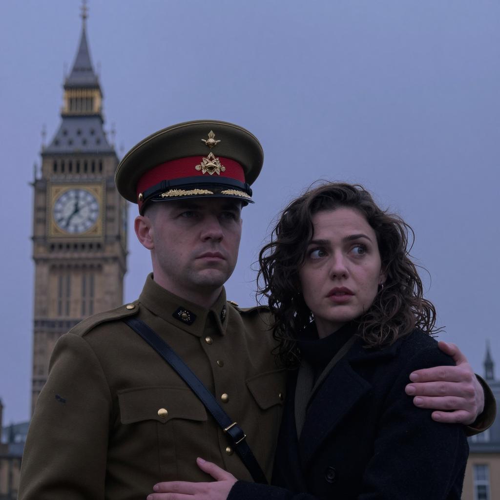 A couple in profile, wearing fur hats and heavy coats, standing close together. Background shows a group of soldiers in winter clothing and gear, with horses, amidst a snowy landscape with a fiery orange and yellow sky. The couple's expressions are serious and focused. The soldiers are in mid-motion, with one soldier holding a flag.