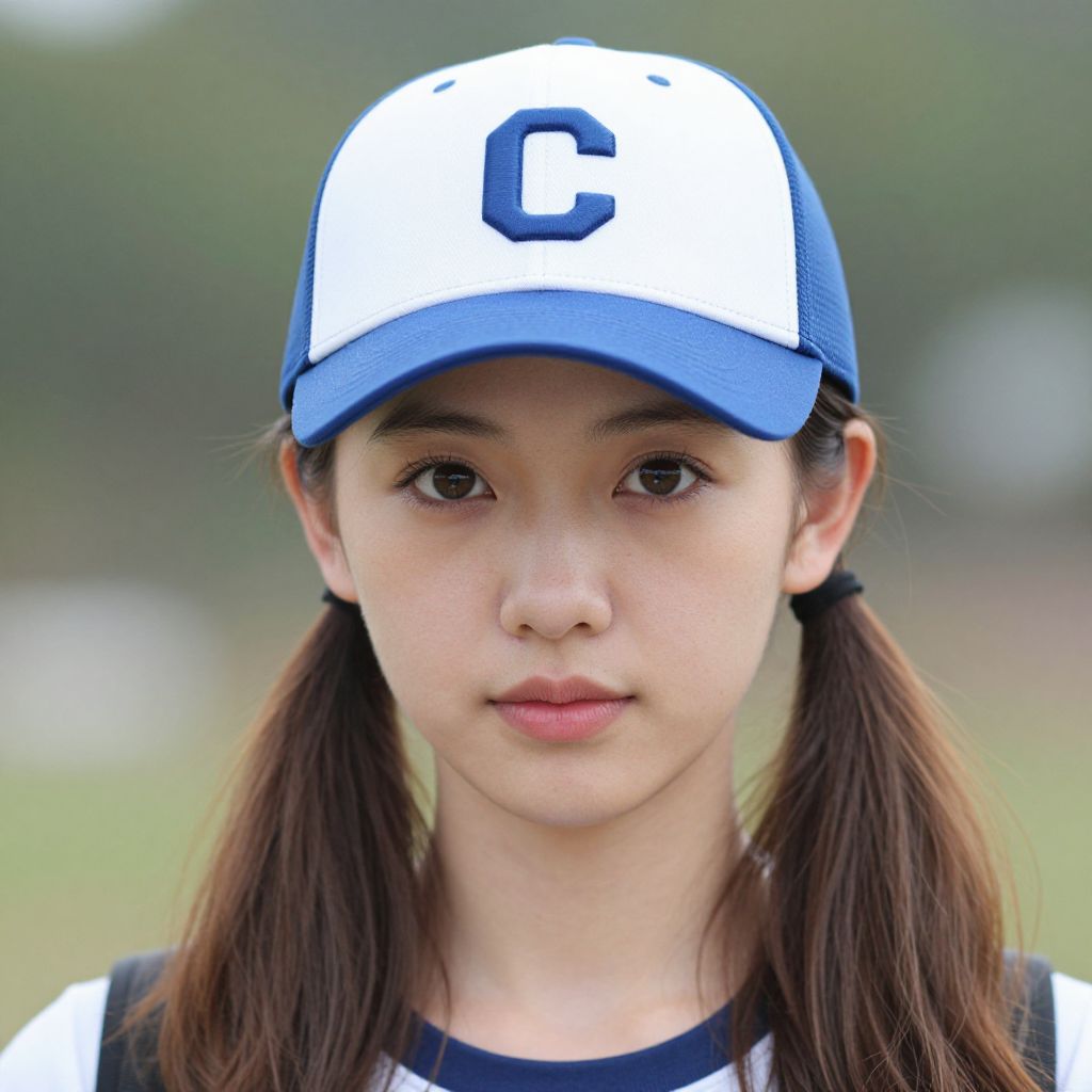 Photograph of an Asian girl with fair skin, brown eyes, and pigtails, wearing a blue and white baseball cap with a large "C