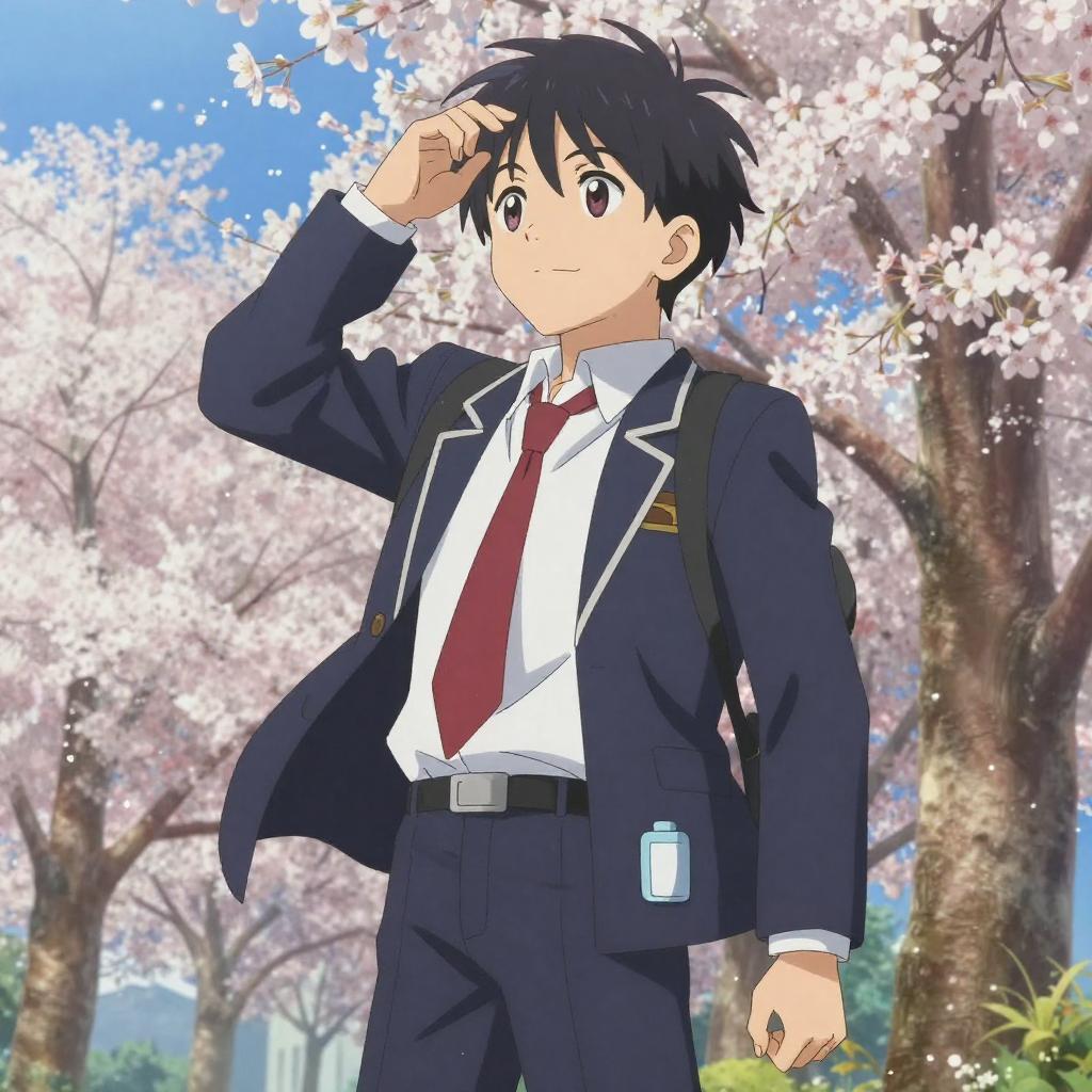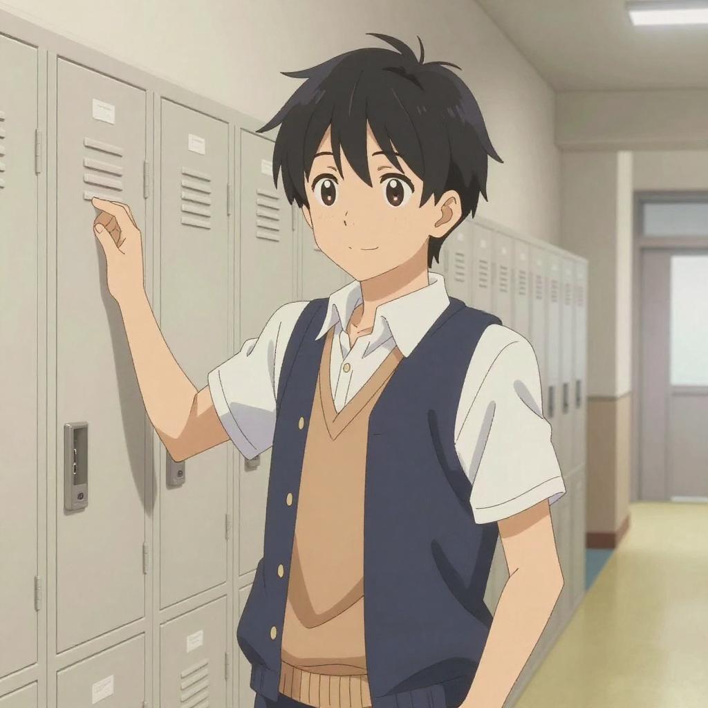 Ugly anime boy with a large nose and awkward smile, disheveled school uniform, awkward posture, graffiti-covered walls behind him, overcast sky, detailed anime style