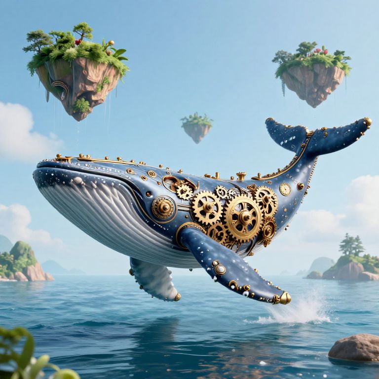 A steampunk-inspired 3D render depicts a colossal clockwork whale adorned with intricate gears and cogs, hovering gracefully above a serene ocean, as its mechanical breath lifts verdant islands into the sky, blending fantasy with industrial aesthetics in a high-definition, otherworldly seascape.