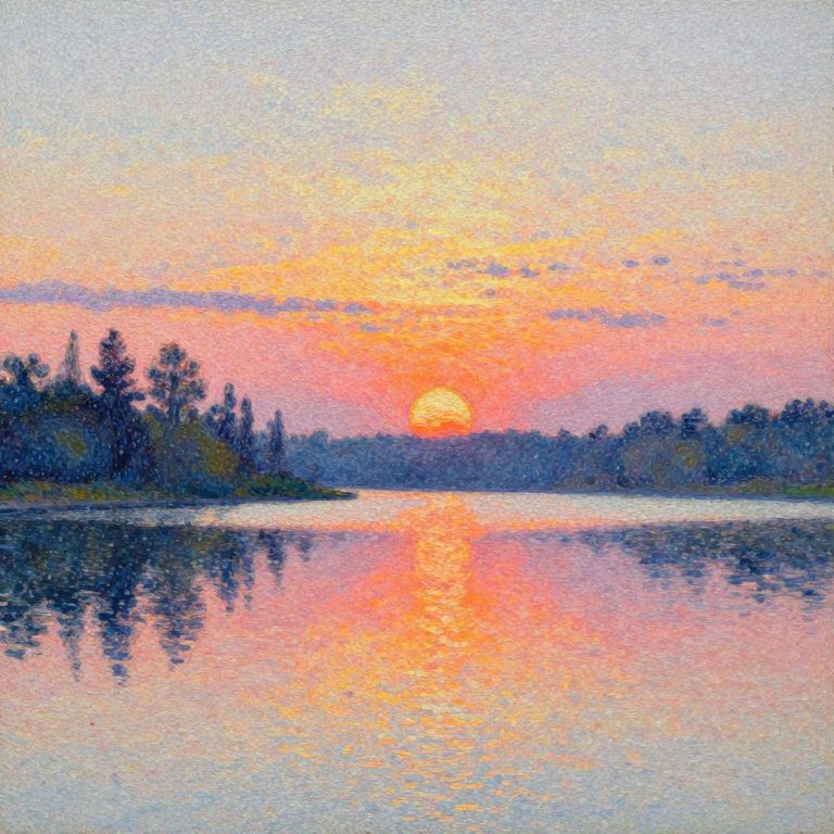 Pointillist Sunrise Over Serene Lake