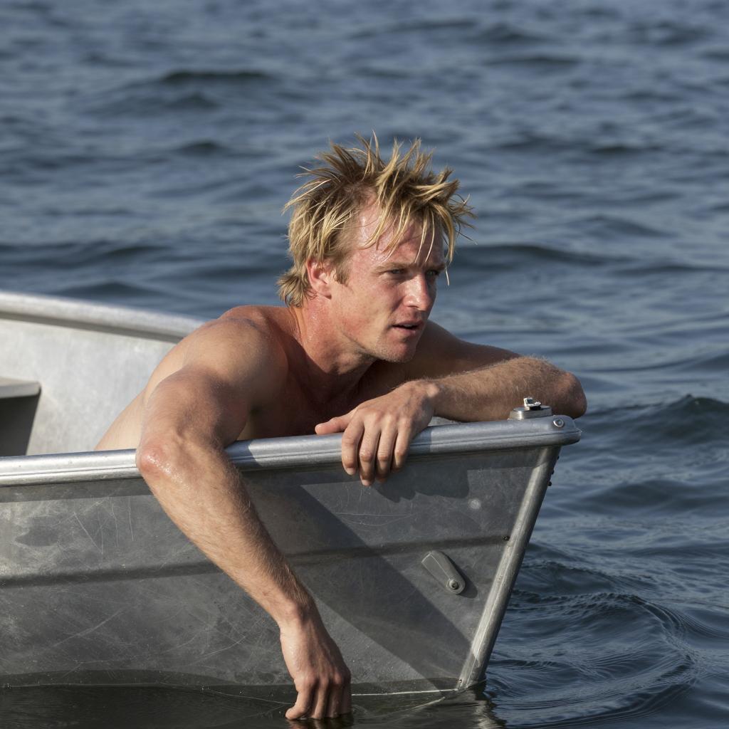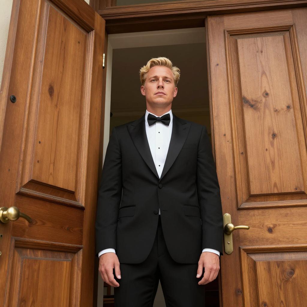 Man with blond hair in a white suit, standing with hands on hips, looking to the right. Large wooden horn with metal mouthpiece attached to a wooden box on a stand. Dense green forest and river in the background.