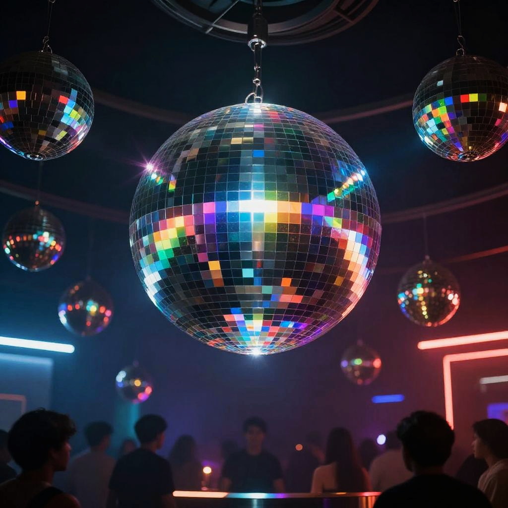 Futuristic diskokugel floating in a sleek modern club, emitting holographic rainbow lights that scatter into geometric patterns, with silhouettes of dancers underneath, glowing ambient light, ultra-detailed mirrors, and atmospheric haze.
